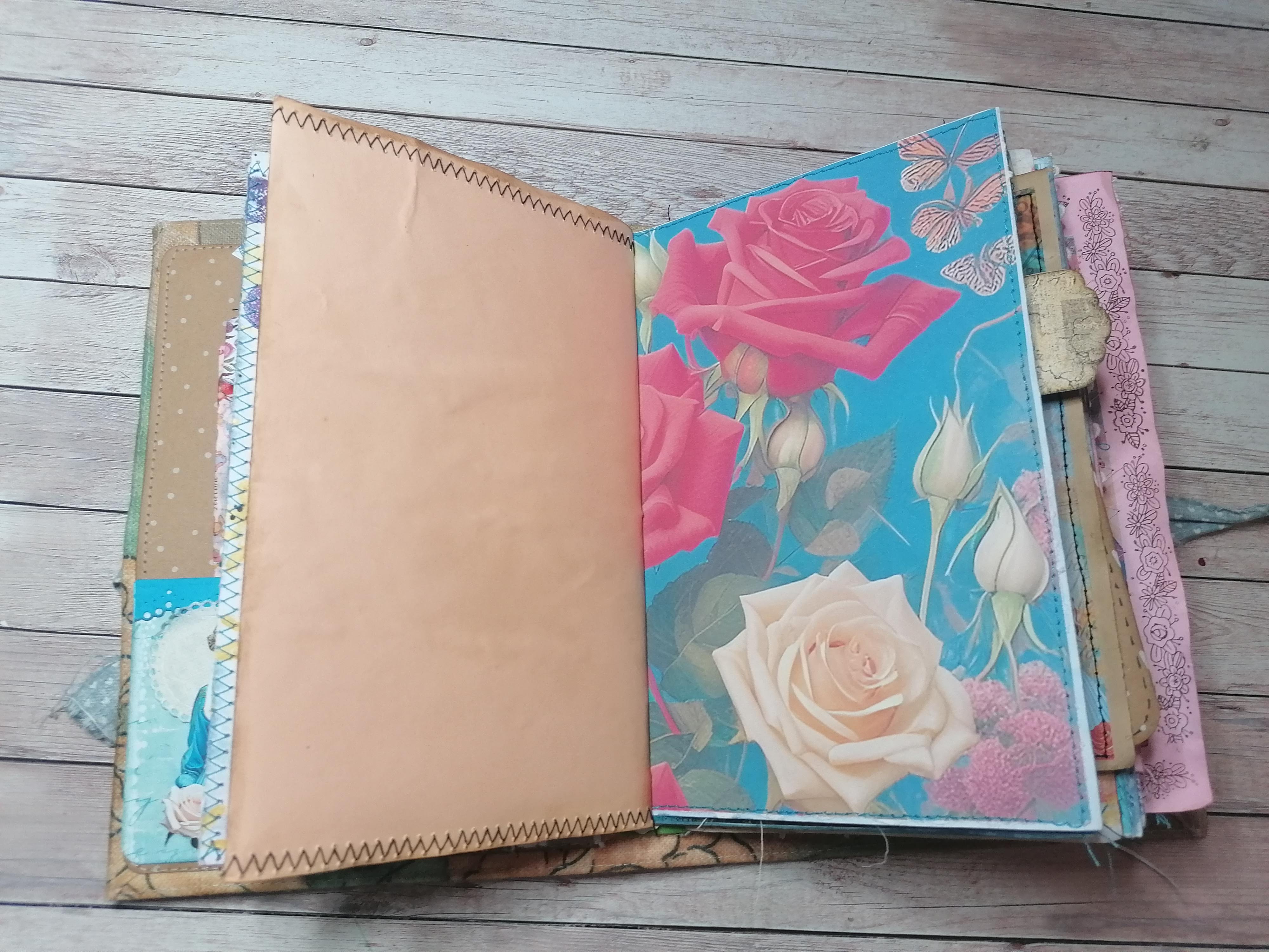 Let's go inside the journal, as I was telling you before I sewed a second stitch later, after I glued a piece of scrapbook paper inside and than a pocket, on both inside covers.
